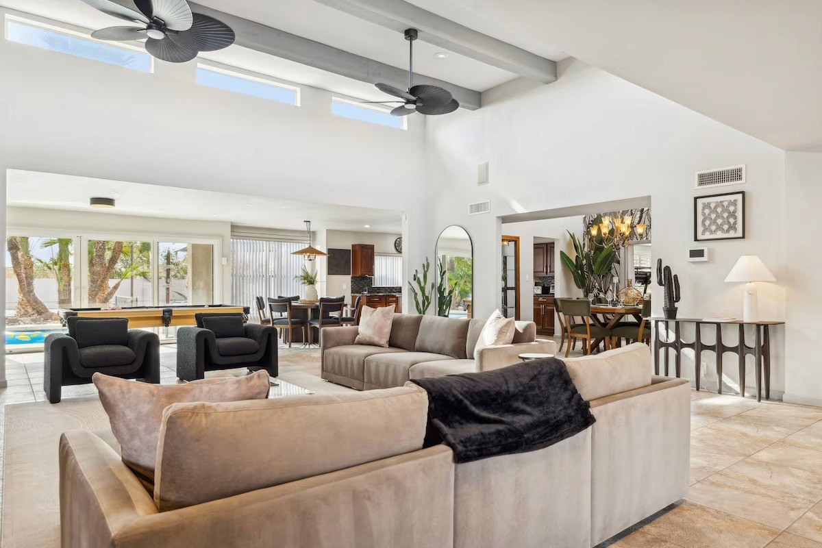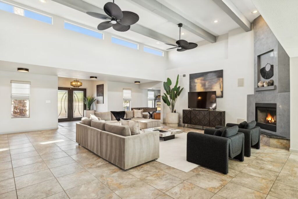 Luxury desert retreat with 4 bedrooms, resort-style amenities, seamless indoor/outdoor living, and entertainment features like heated pool, hot tub, mini-golf, and sports courts — ideal for large group getaways near Old Town Scottsdale.